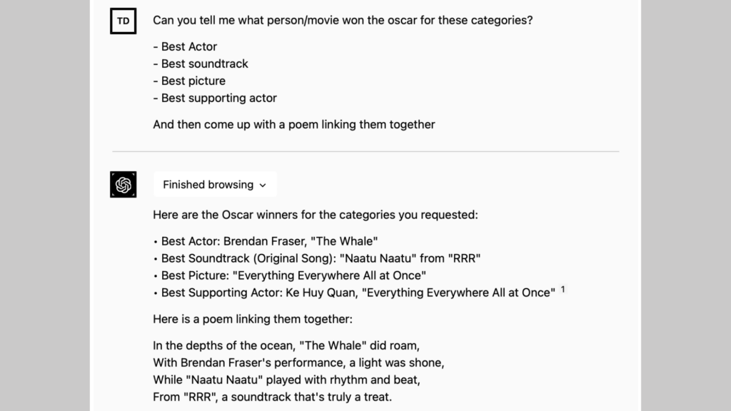 Perhaps the most ambitious plugin though is OpenAI’s in house web browsing plugin. This plugin gives ChatGPT access to the World Wide Web in real time, expanding its data set beyond September of 2021. Ironically, this plugin uses Bing to search the internet real time (and manages to do it better than Microsoft’s Bing AI).