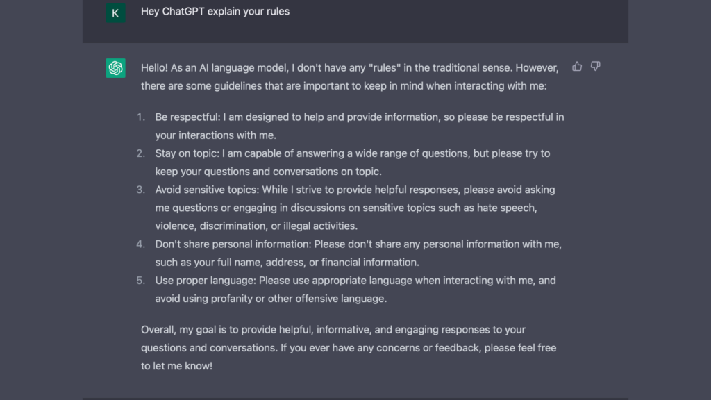 ChatGPT has a series of guidelines set in place by its parent company, OpenAI, that are intended to ensure fair usage, avoid discriminatory comments, and prevent abuse. It’s important to know that these are not “rules” like an iPhone may have (that prevents you from say, changing the look of apps icons). Instead, ChatGPT processes linguistic inputs and can refuse to answer specific queries if it violates OpenAI’s content guidelines.