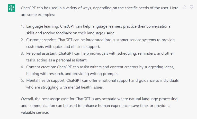 To start with though, I decided to go straight to the source, and ask ChatGPT itself what its best uses were. It gave me the following: