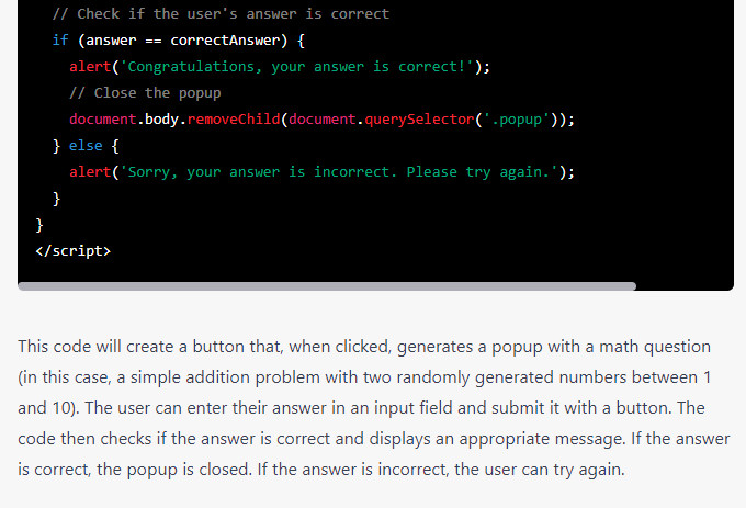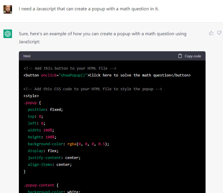 I further asked it for a specific scenario–a Javascript that would create a popup asking the user to solve a simple math problem–and it produced exactly what I asked for in seconds. ChatGPT handles a huge variety of coding languages from Javascript to C, and in addition to helping you generate code, it can also debug what you already have.