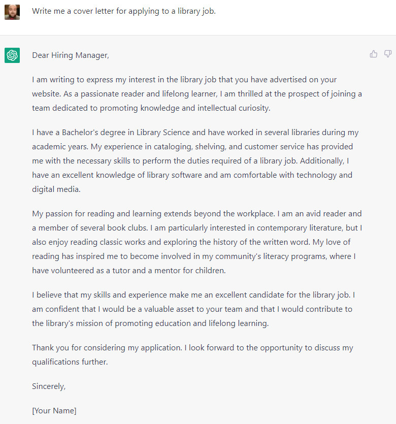 As a test, I asked ChatGPT to write a query letter one would send to a publisher based on a one-sentence description of my first novel. The results, while slightly generic, were surprisingly good, and would certainly be adequate to fronting most job applications or similar boilerplates. Here’s an example based on the prompt “Write me a cover letter for applying to a library job.”