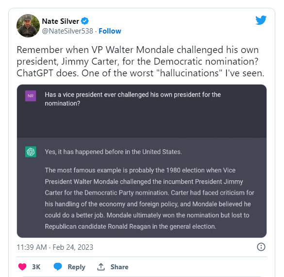 After asking ChatGPT a question about vice presidents challenging a sitting US President for the nomination, ChatGPT recounted the most famous case of this, Walter Mondale challenging Jimmy Carter for the 1980 Democratic nomination for President.