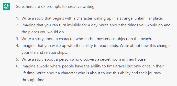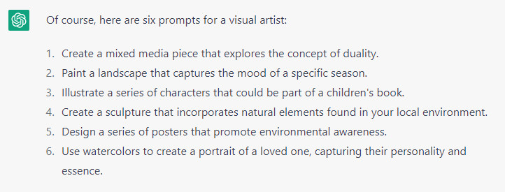 On the less mundane side, maybe you’re trying to do something creative, but the juices aren’t flowing. You can always ask ChatGPT to give you a starting point, such as “Provide me with six prompts for creative writing.” Or “Provide me with six prompts for a visual artist.” Or “Provide me with six ideas for blog content.”