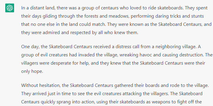 Sometimes, children have highly specific ideas about what kind of entertainment they want. Parents might hem and haw when asked to provide a story about, say, a group of centaurs who ride skateboards and fight evil. Fortunately, ChatGPT is rarely at a loss for words. Want to keep the kiddos entertained? Exploit ChatGPT as your backstage scriptwriter, or just hand the kids the keyboard themselves and let them generate stories as wild as they can imagine.