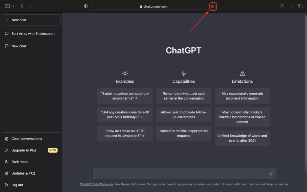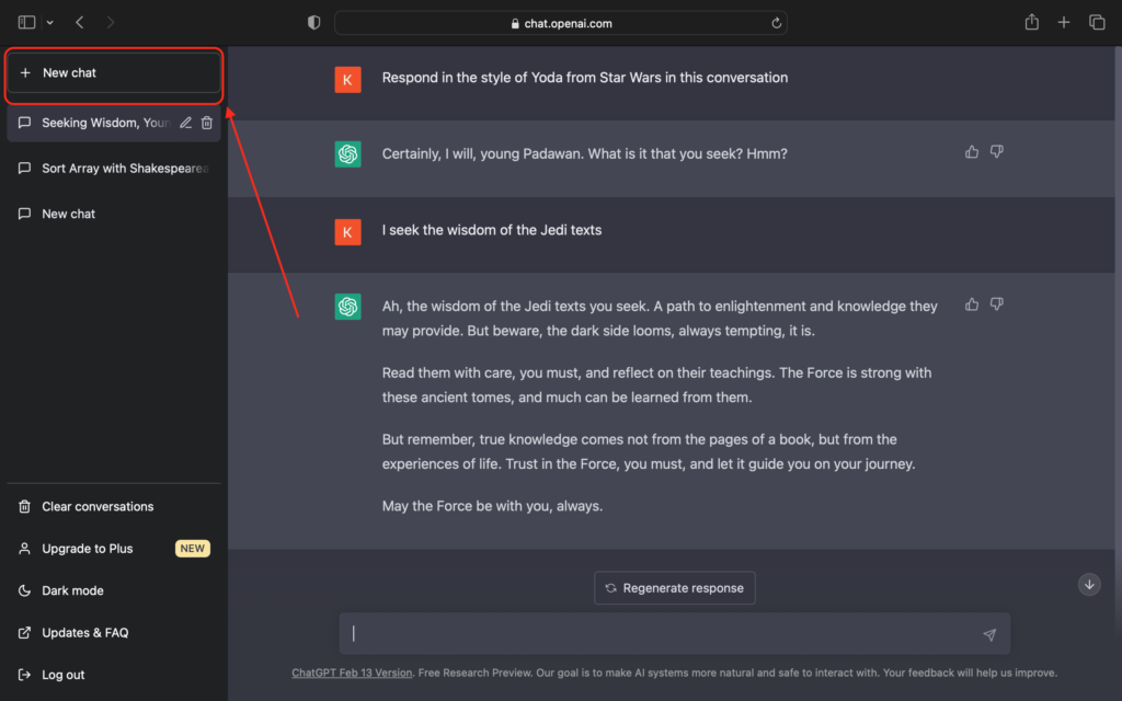 ChatGPT uses “threads” to separate conversations and stylistic guidelines. For example, if you tell ChatGPT “respond in the style of Yoda from Star Wars for the rest of the conversation, that command will hold through the thread. Sometimes, resetting your thread is sufficient to clear the Error in Body Stream message. Do this using the New Chat button in the top left of the ChatGPT window:
