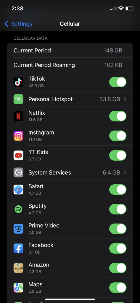 Next, you will scroll down to the section called “Cellular Data” where all the applications are you can turn off access to your cellular data. Just turn off all of them or the ones you don’t normally use.