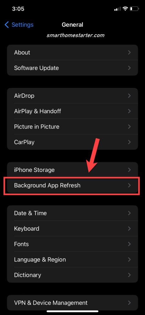 Scroll down to “General” and open it up. There will be several options on this screen, but “Background App Refresh” will be about midway.