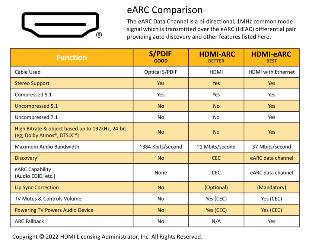 Fortunately, the HDMI 2.1 standard introduced a newer, upgraded version of ARC. Called Enhanced Audio Return Channel, or eARC, it supports a wider array of audio formats. This includes uncompressed 5.1 surround sound, uncompressed 7.1, Dolby Atmos, and DTS:X.