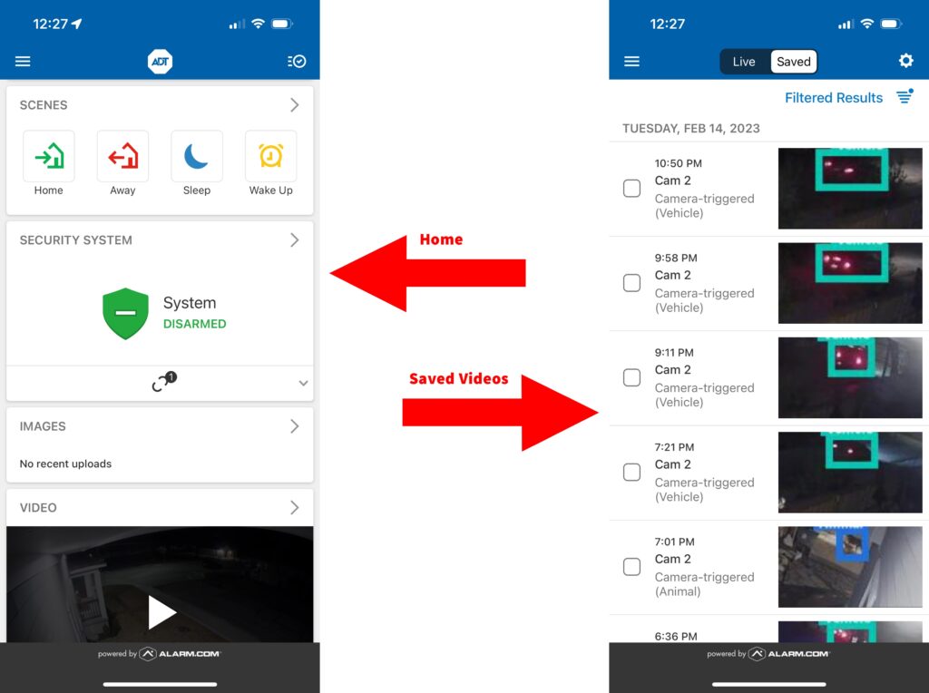 ADT’s Alarm.com app connects directly to your security panel and cameras so that you can access a live feed of your home anywhere that you have cell service (or Wi-Fi).
