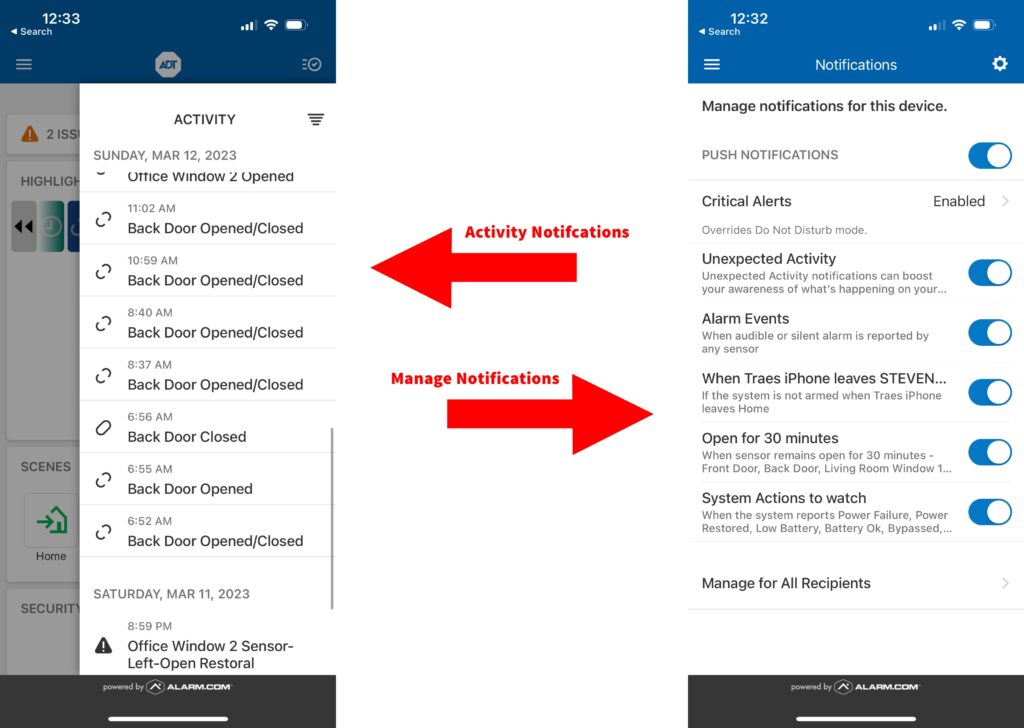I use the Alarm.com app to see what has been happening throughout the house. My entire first floor is covered. Every window and door has a sensor that tracks when it is opened and closed, and sends notifications letting me know. All activity is tracked and I access it through the app.