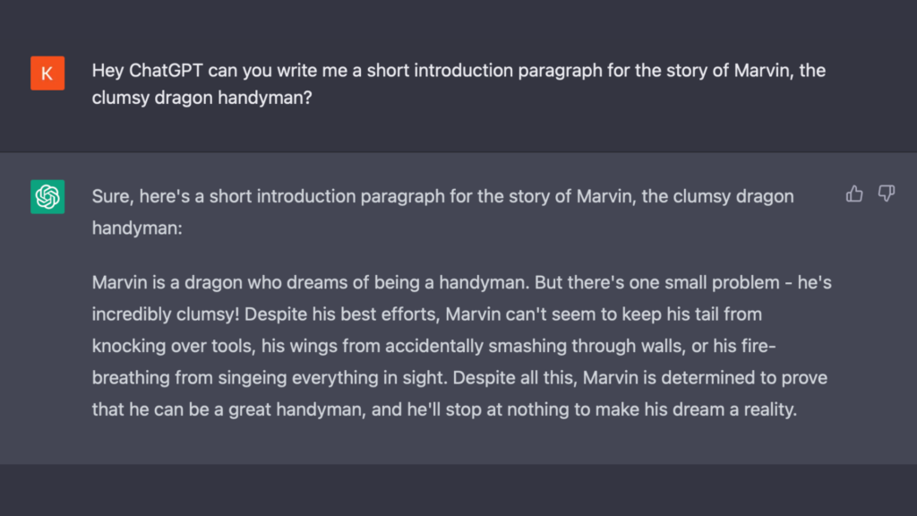 You nailed it ChatGPT! One of the most important tips for expanding on complex topics or flushing out details is to use follow up questions. Remember that ChatGPT is conversational, meaning it can use context clues to determine meanings without needing to constantly restate information. Let’s see how this relates to a query to write a creative story. First, let’s have ChatGPT write an opening: